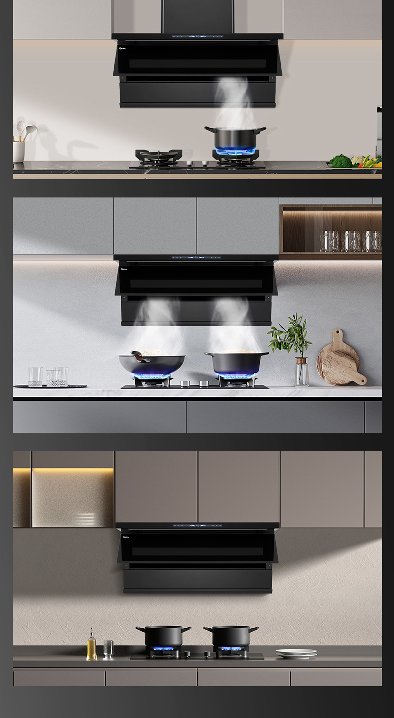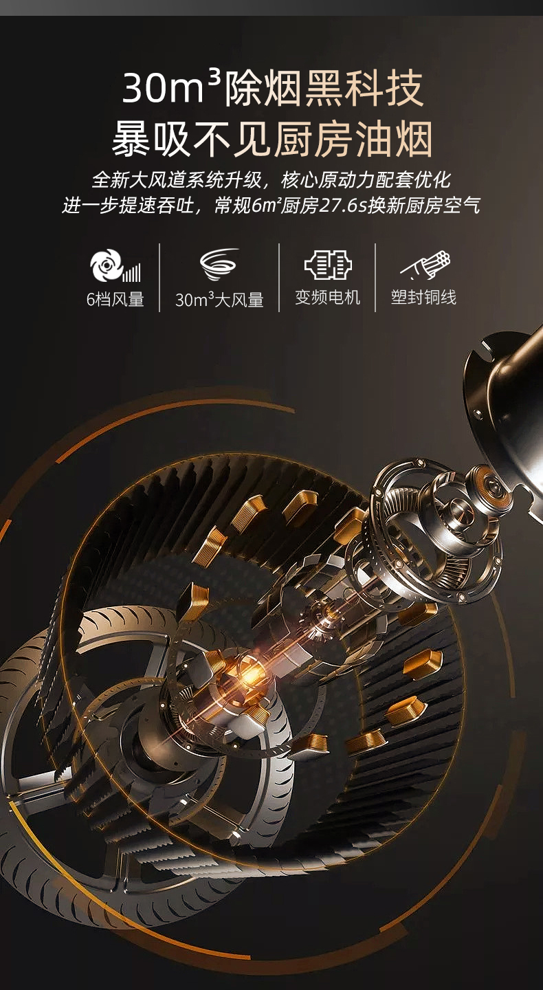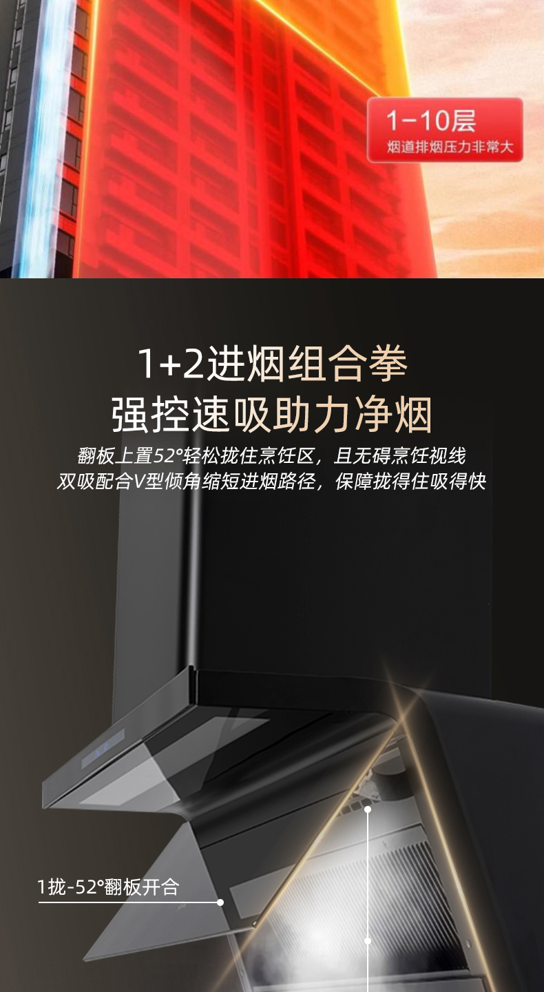 4、翻板速吸设计,两段式电动开合,较固定进烟口提速15%
