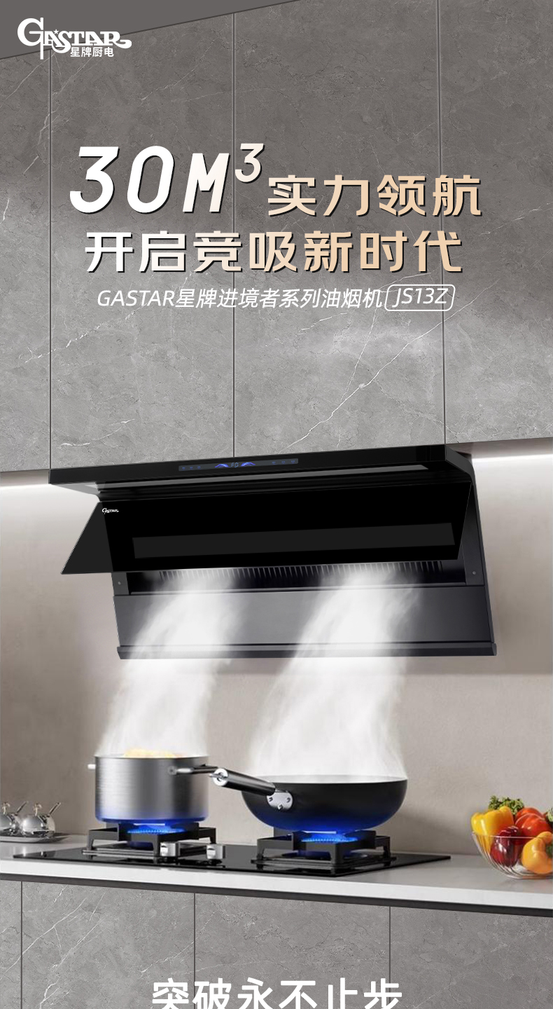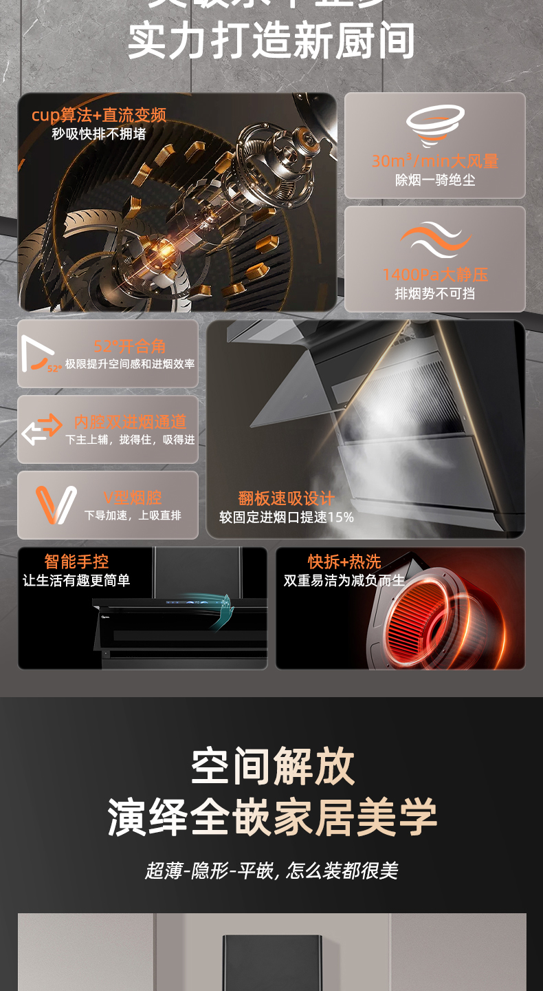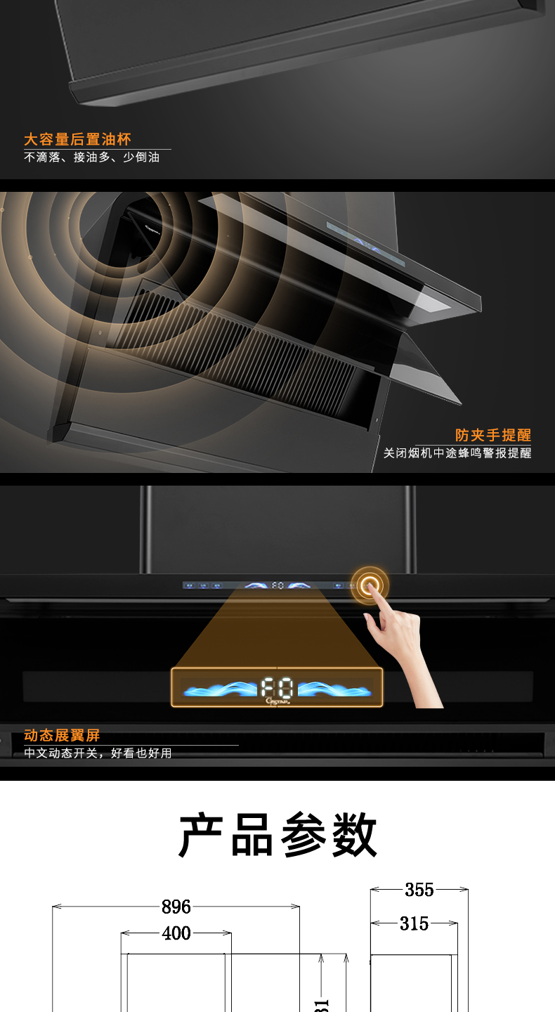 4、翻板速吸设计,两段式电动开合,较固定进烟口提速15%