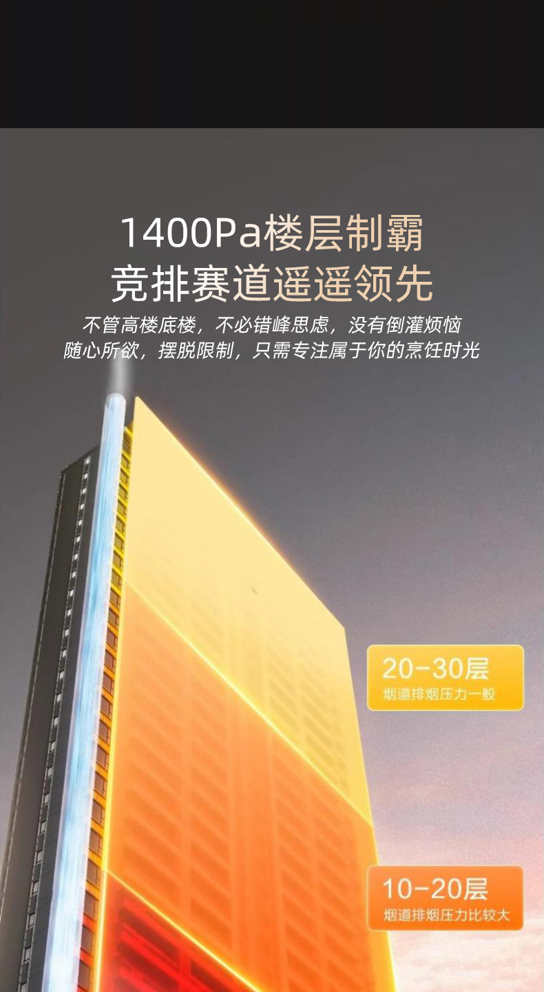 2、直流变频铜线电机,自主变速无极调节,1400Pa超大静压,高低楼层畅排无阻