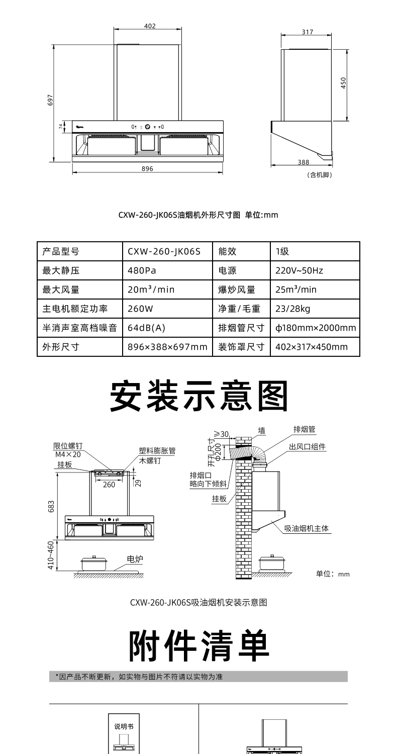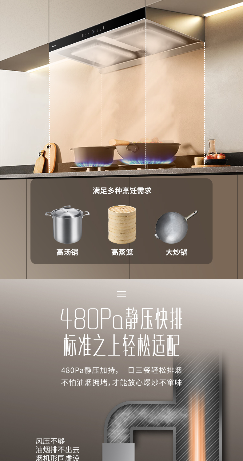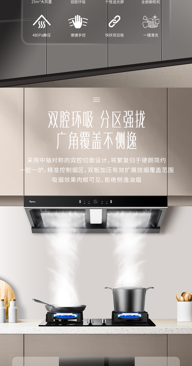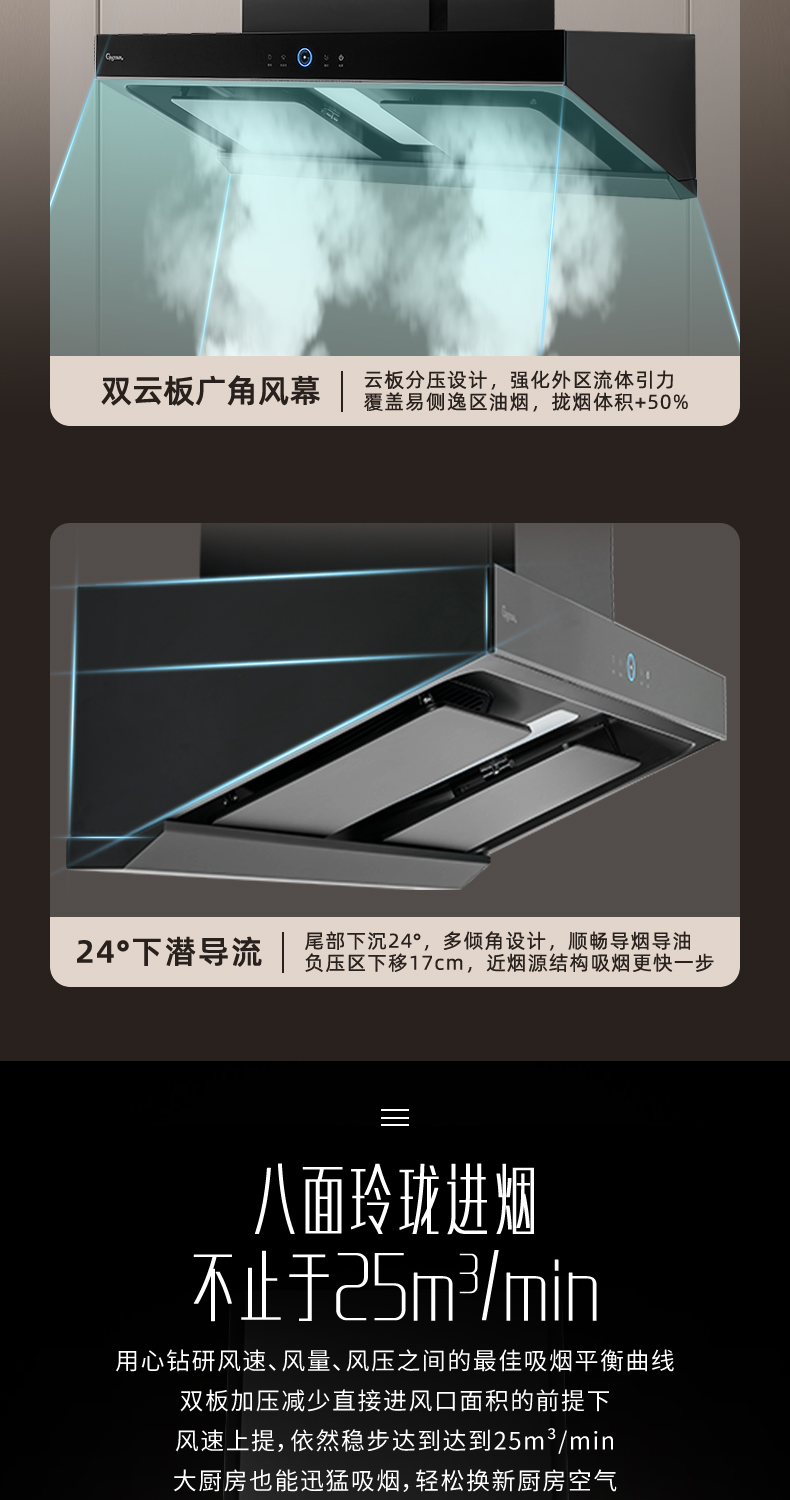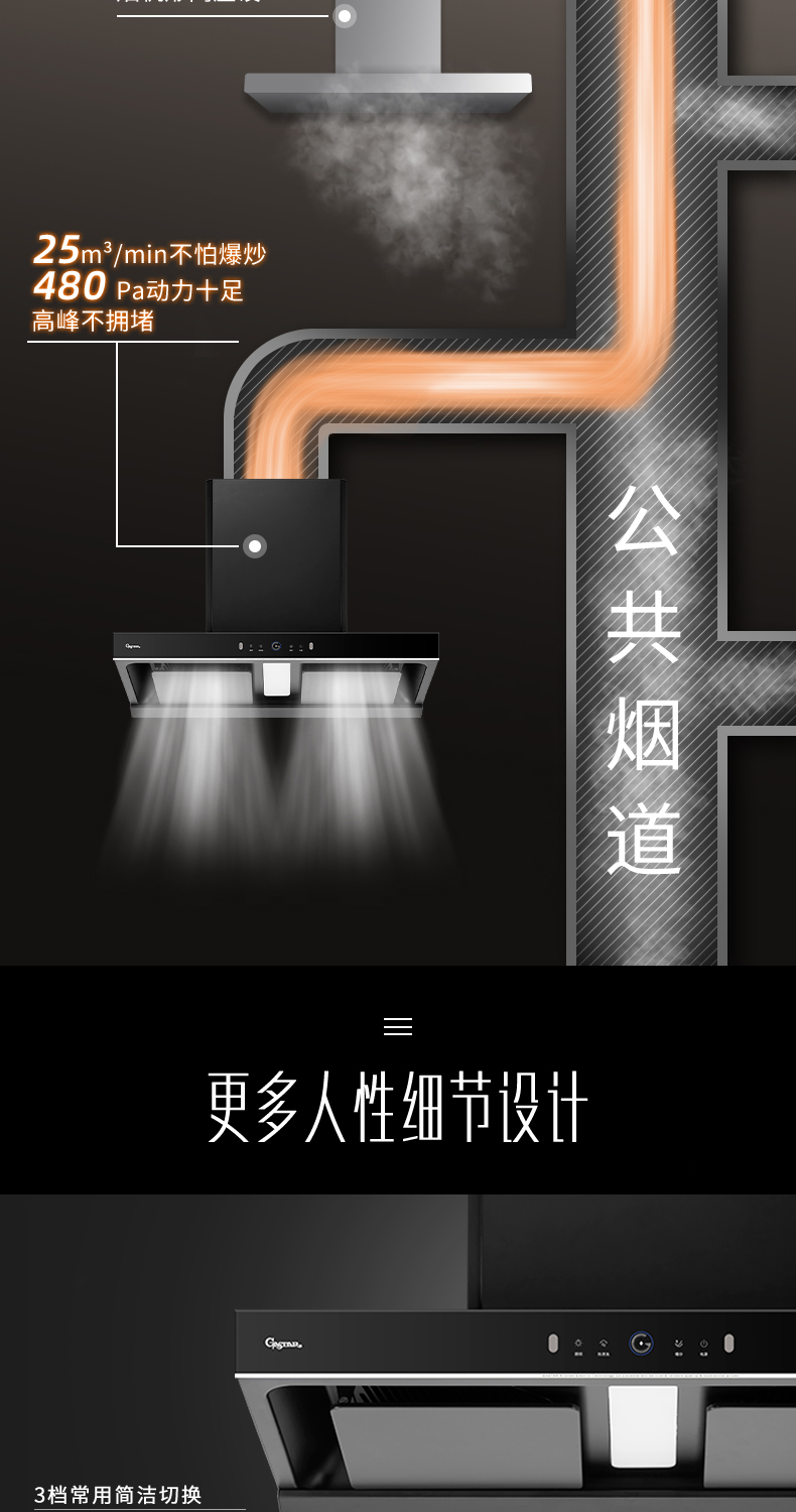 4、2速+爆炒计3档切换25风量,关机3min延时余烟净